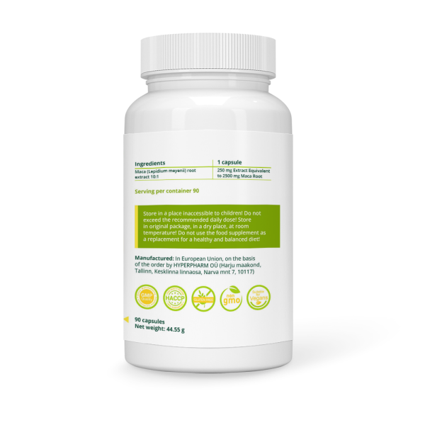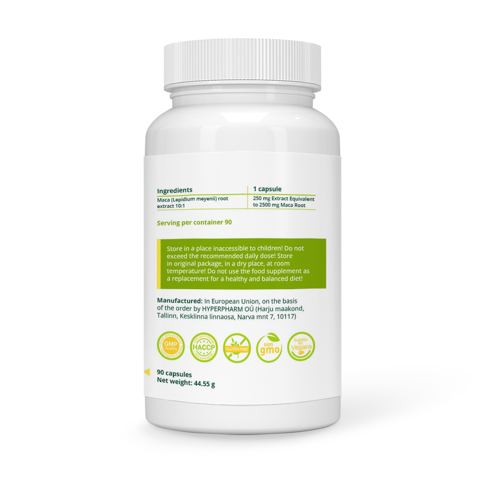 | Maca juure (Lepidium meyenii) ekstrakt 10:1 | 250 mg ekstrakti, mis vastab 2500 mg Maca juurele |