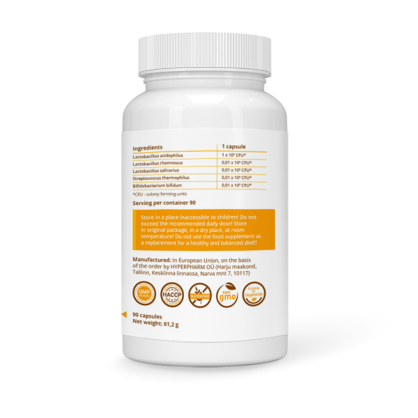 Koostisosad: täiteained: dikaltsiumfosfaat, mikrokristalliline tselluloos; kapsli kest: hüdroksüpropüülmetüültselluloos; paakumisvastased ained: magneesiumstearaat, ränidioksiid; Lactobacillus acidophilus, Streptococcus thermophilus, Lactobacillus salivarius, Bifidobacterium bifidum, Lactobacillus rhamnosus.
