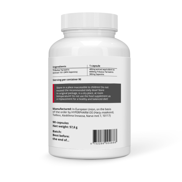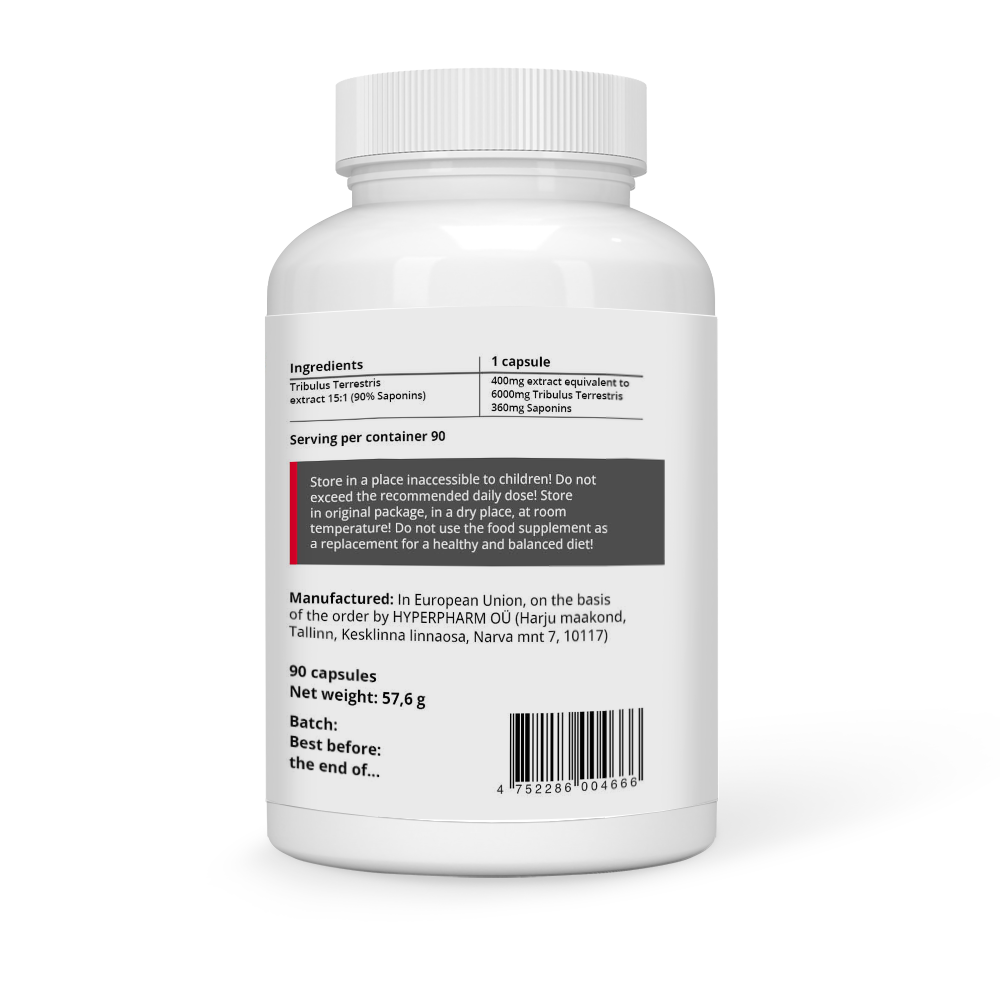 | Tribulus Terrestris ekstrakt 15:1 (90% saponiinid) | 400 mg, ekstrakti ekvivalentne kogus 6000 mg Tribulus Terrestris, sisaldab 360 mg saponiine |
