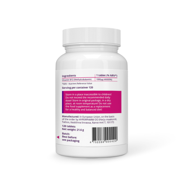 Alkuperäinen hinta oli: €16.90.€8.45Nykyinen hinta on: €8.45.Metyylikobalamiini Vitamin B12 1000 mcg Vegaanitabletit