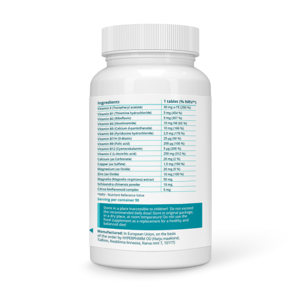 Sudėtis: kalcio karbonatas; užpildas: mikrokristalinė celiuliozė; L-askorbo rūgštis, tokoferilio acetatas, magnolijos (Magnolia virginiana) ekstraktas, magnio oksidas, šizandra (Schisandra chinensis) milteliai, cinko oksidas, kalcio D-pantenolatas, nikotinamidas; prieskonių absorbuojantis medžiaga: magnio stearatas; plėvelė: hidroksipropilmetilceliuliozė; riboflavinas, tiamino hidrochloridas, vario sulfatas, citrusinių bioflavonoidų kompleksas; prieskonių absorbuojantis medžiaga: silicio dioksidas; piridoksino hidrochloridas, folio rūgštis, D-biotinas, cianokobalaminas.