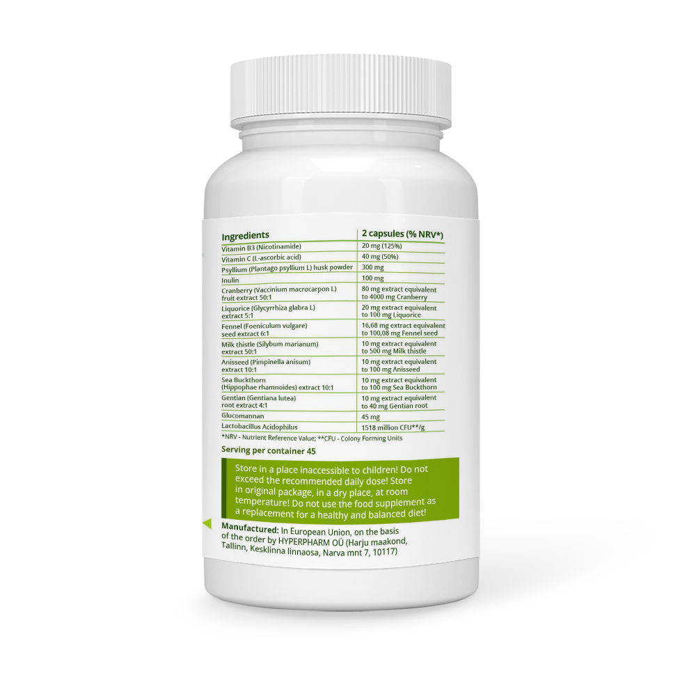 Sudėtis: pildymo medžiaga: dikalcio fosfatas; psylliumo lukštų (Plantago psyllium) milteliai; kapsulės apvalkalas: hidroksipropilmetilceliuliozė; inulinas, spanguolių (Vaccinium oxycoccus) ekstraktas 50:1, L-askorbo rūgštis, gliukomananas (iš Konjako ekstrakto) milteliai; pildymo medžiaga: mikrokristalinė celiuliozė; saldymedžio (Glycyrrhiza glabra L) ekstraktas 5:1, nikotinamidas, krapų sėklų (Foeniculum vulgare) ekstraktas 6:1, pieno šilės (Silybum marianum) ekstraktas 50:1, anižo (Pimpinella anisum) ekstraktas 10:1, šaltalankių (Hippophae rhamnoides) ekstraktas 10:1, gintaro šaknies (Gentiana lutea) ekstraktas 4:1, Lactobacillus acidophilus, prieskonių medžiaga: silicio dioksidas.