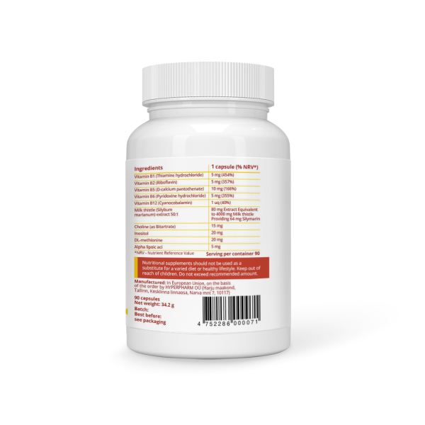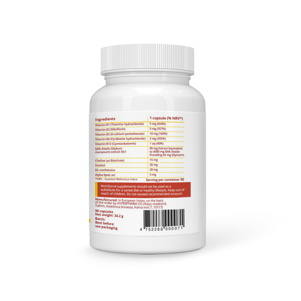 Sudėtis: pagalbinė medžiaga: mikrokristalinė celiuliozė; pieno šalavijų (Sílybum mariánum) ekstraktas 50:1; kapsulės apvalkalas: hidroksipropilmetilceliuliozė; inozitolis, DL-metioninas, cholino bitartratas, D-kalcio pantotenatas; priedų nuo susilpnėjimo agentai: magnio stearatas, silicio dioksidas; piridoksino hidrochloridas, tiamino hidrochloridas, riboflavinas, alfa lipoinė rūgštis, cianokobalaminas.