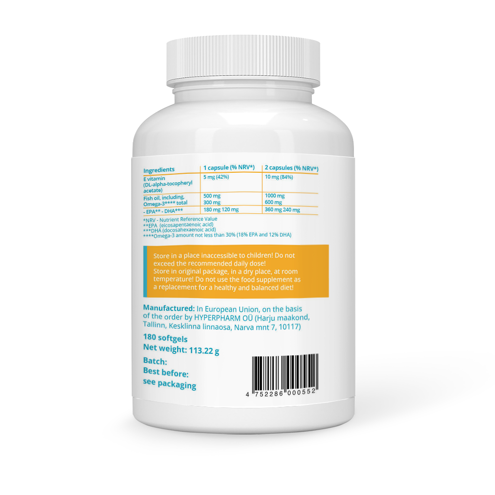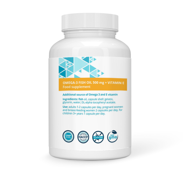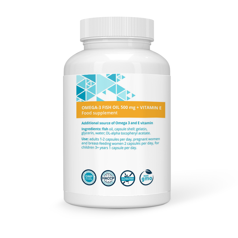 Original price was: €12.10.€8.99Current price is: €8.99.Omega-3 žuvų taukai 500 mg + vitaminas E