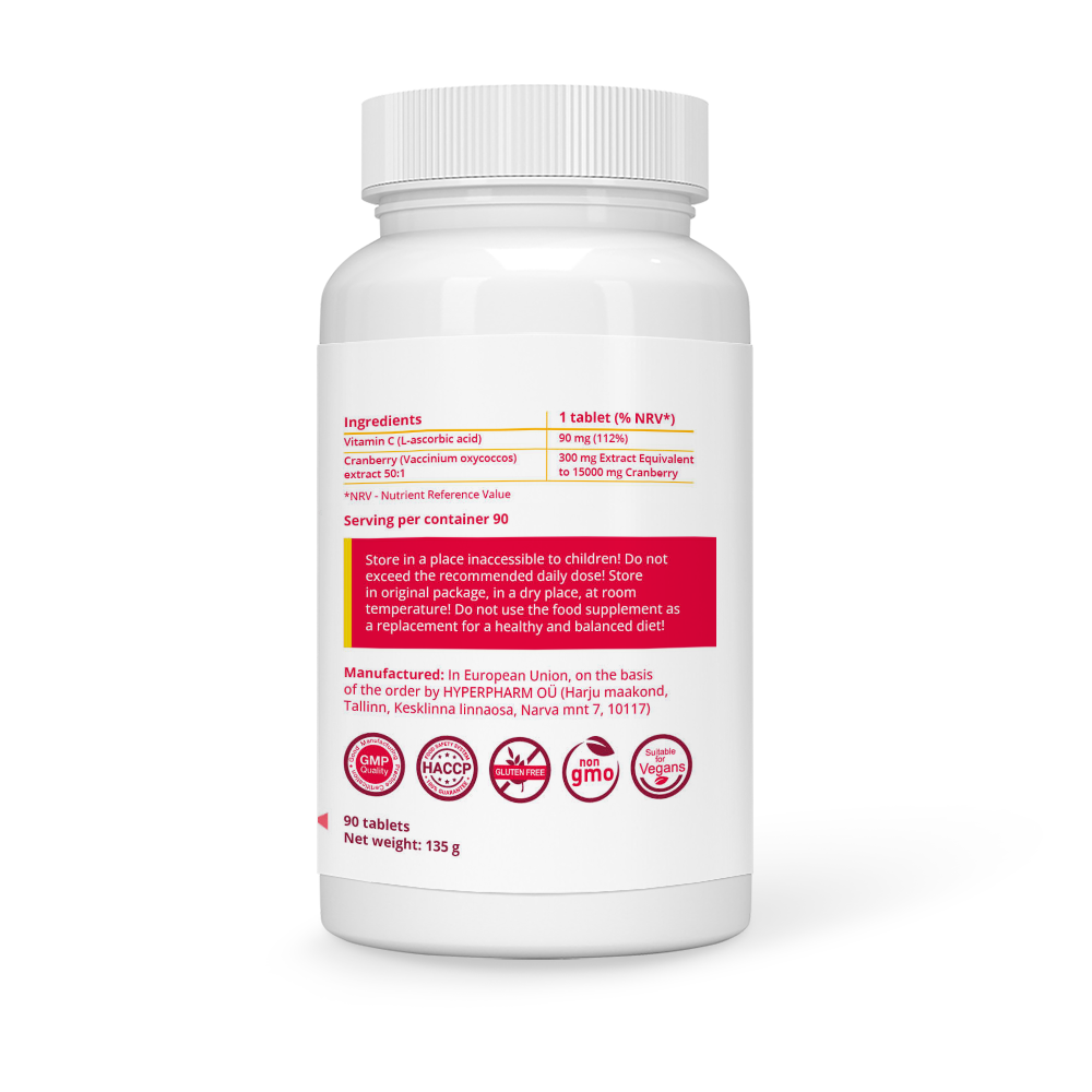 Ingredientai: kalcio karbonatas, spanguolių (Vaccinium oxycoccos) ekstraktas 50:1; pūdiklio medžiaga: mikrokristalininė celiuliozė; L-askorbo rūgštis, apvalkalas: hidroksipropilmetilceliuliozė; nuo kietėjimo medžiagos: magnio stearatas, silicio dioksidas.