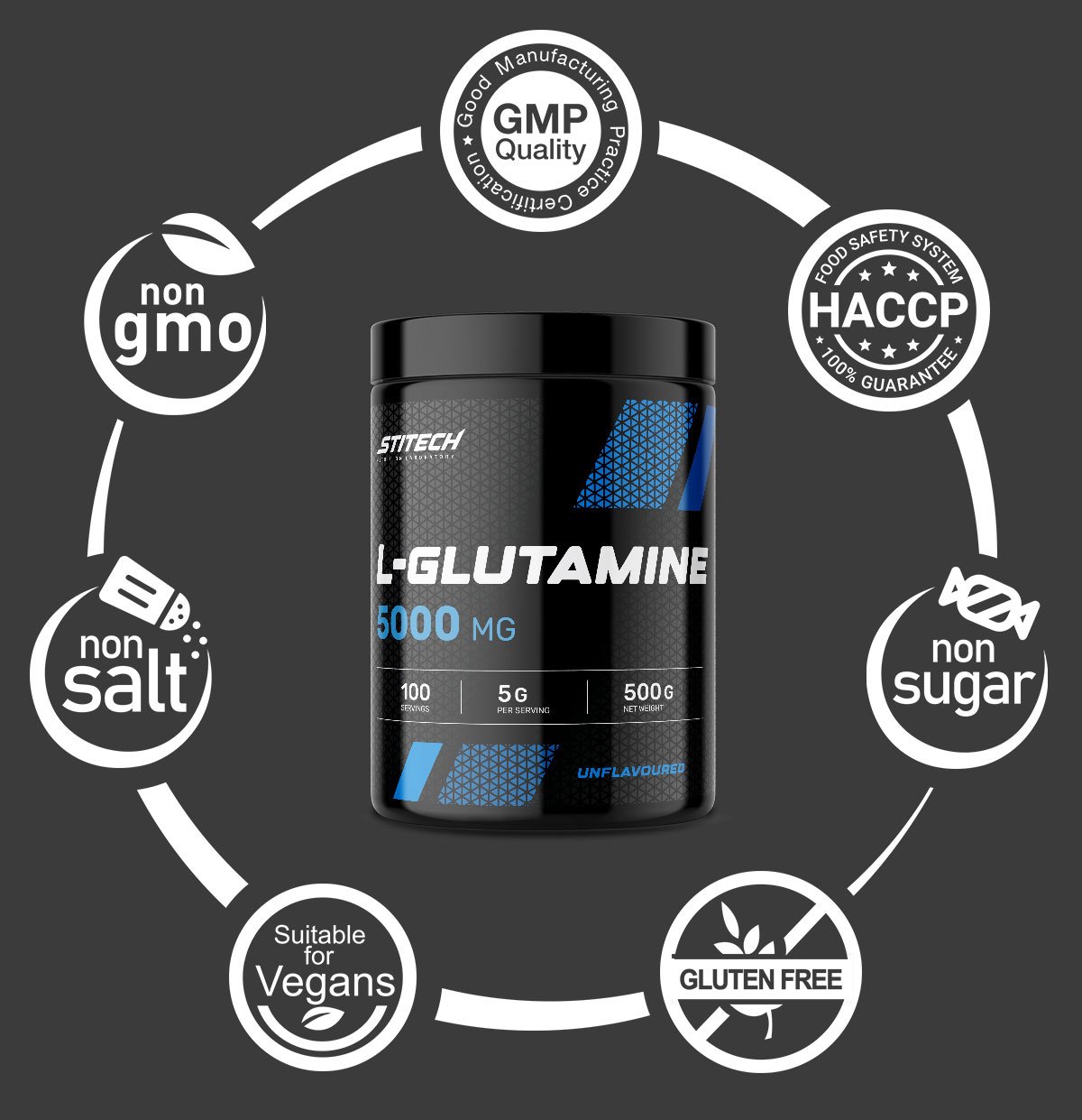 Stitech L-GLUTAMINE yra svarbi aminorūgštis, kuri palaiko raumenų atsigavimą, imuninę funkciją ir žarnyno sveikatą, ypač po intensyvių treniruočių.