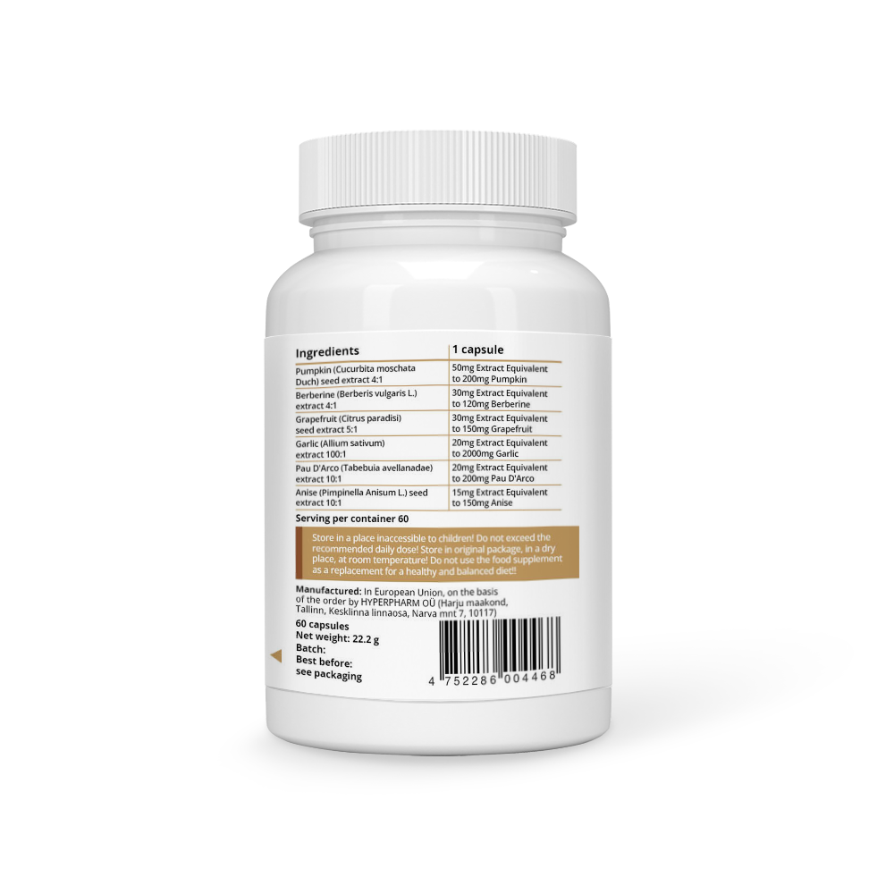 Ingredients: capsule shell:hydroxypropylmethylcellulose; bulking agent: cellulose microcrystalline; pumpkin (Cucurbita moschata Duch) seed extract, bulking agent: dicalcium phosphate; berberine (Berberis vulgaris L.) extract, grapefruit (Citrus paradisi) seed extract, garlic (Allium sativum) extract, pau d’arco (Tabebuia avellanadae) extract, anise (Pimpinella Anisum L.) seed extract, anti-caking agents: magnesium stearate, silicon dioxide.