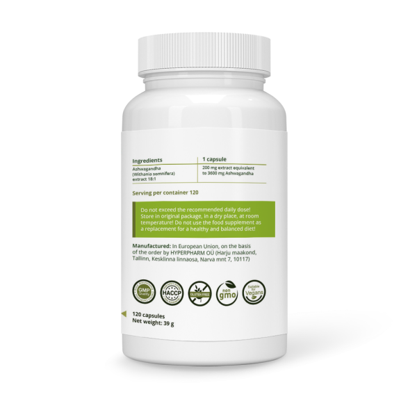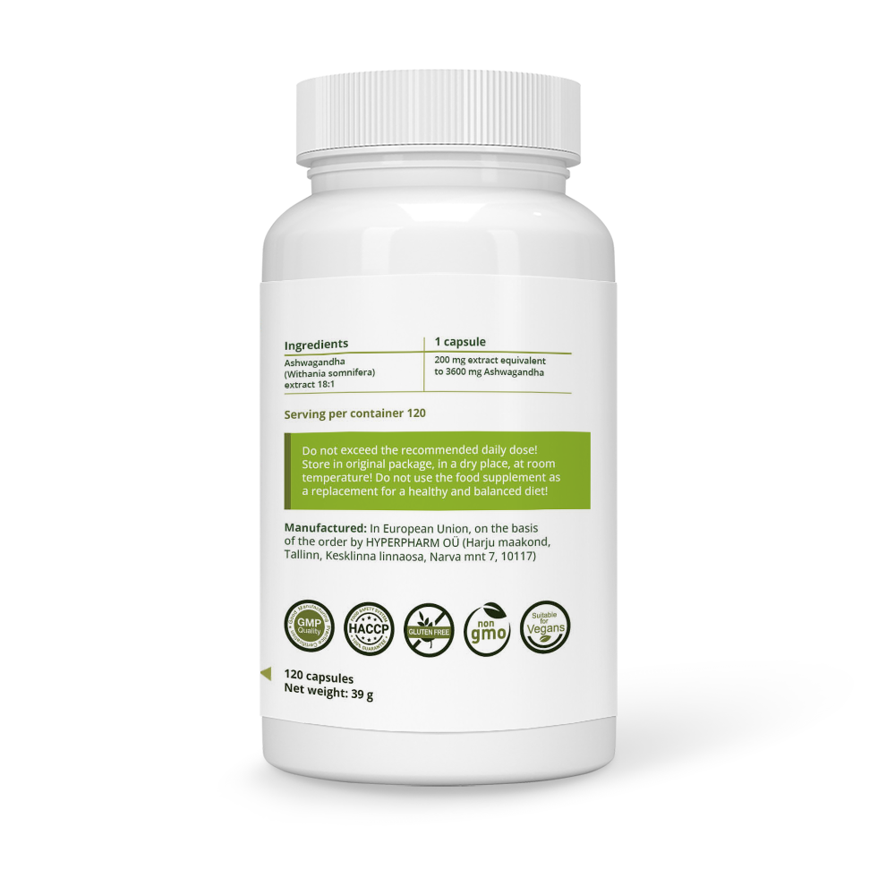 Ingredients: Ashwagandha (Withania somnifera) extract 18:1, bulking agents: microcrystalline cellulose, dicalcium phosphate; capsule shell: hydroxypropylmethylcellulose; anti-caking agents: magnesium stearate, silicon dioxide.