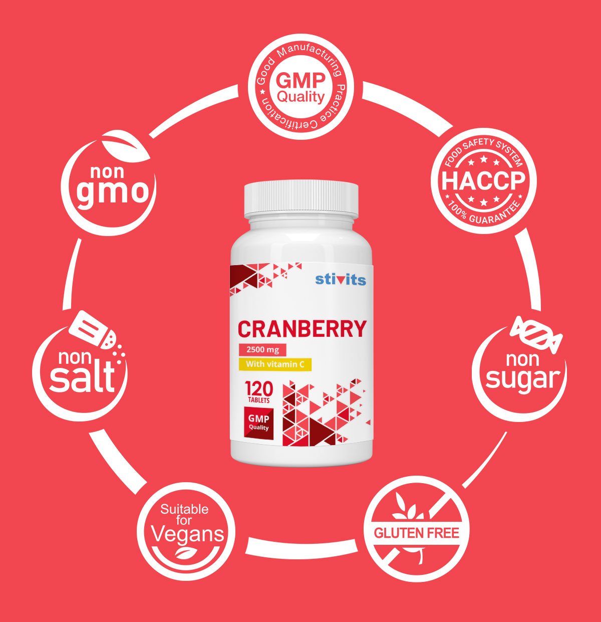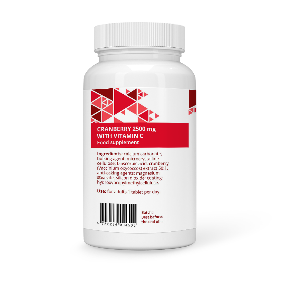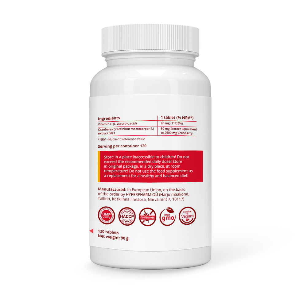 Ingredients: calcium carbonate, bulking agent: microcrystalline cellulose; L-ascorbic acid, cranberry (Vaccinium oxycoccos) extract 50:1, anti-caking agents: magnesium stearate, silicon dioxide; coating: hydroxypropylmethylcellulose.