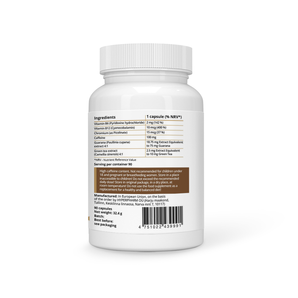 Ingredients: bulking agent: dicalcium phosphate; caffeine; capsule shell: hydroxypropylmethylcellulose; guarana (Paullinia cupana) extract 4:1; anti-caking agents: magnesium stearate, silicon dioxide; green tea (Camellia sinensis) extract 4:1, pyridoxine hydrochloride, chromium picolinate, cyanocobalamin.