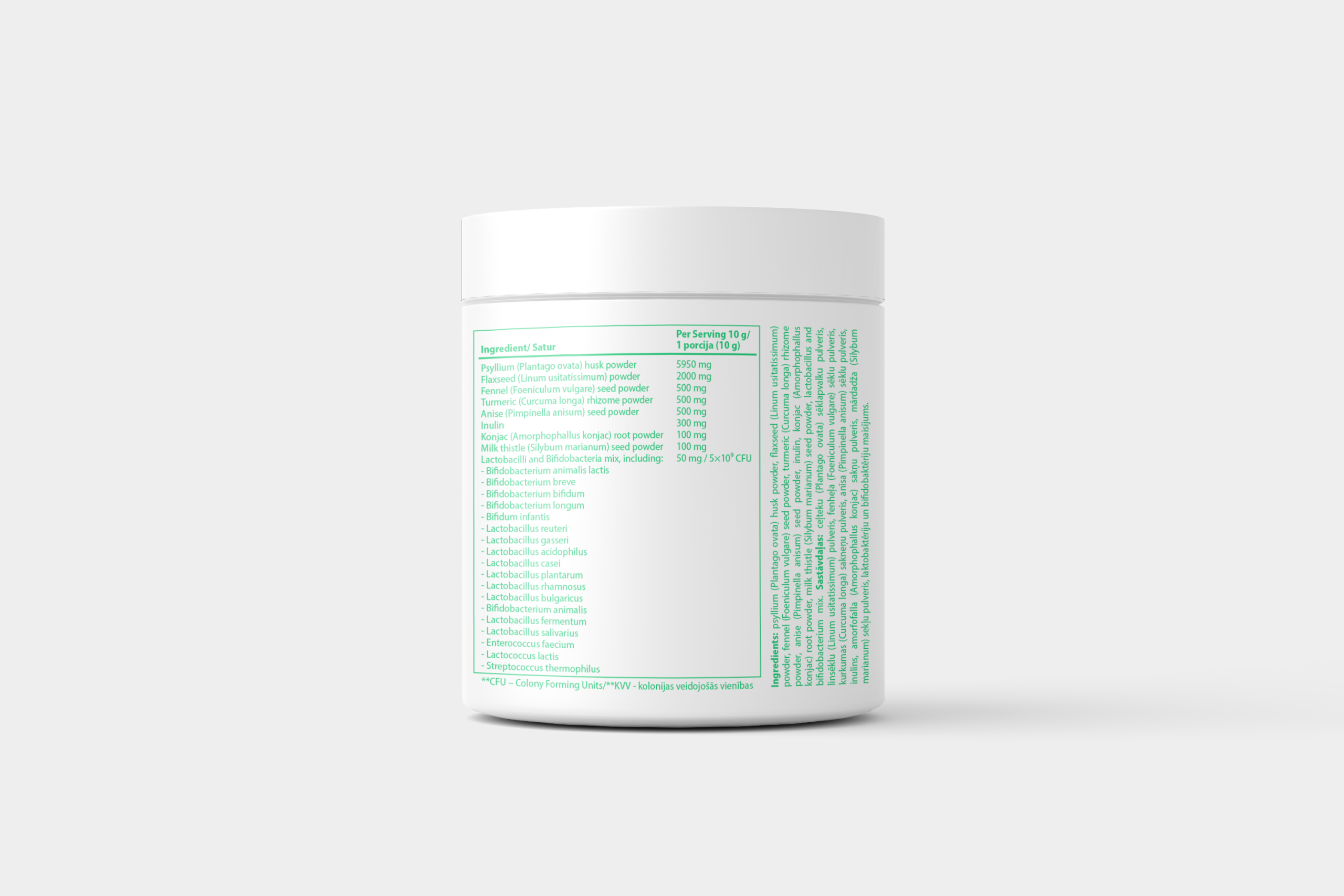 Ingredients: Psyllium (Plantago ovata) husk powder, flaxseed (Linum usitatissimum) powder, fennel (Foeniculum vulgare) seed powder, turmeric (Curcuma longa) rhizome powder, anise (Pimpinella anisum) seed powder, inulin, konjac (Amorphophallus konjac) root powder, milk thistle (Silybum marianum) seed powder, a mix of lactobacilli and bifidobacteria.