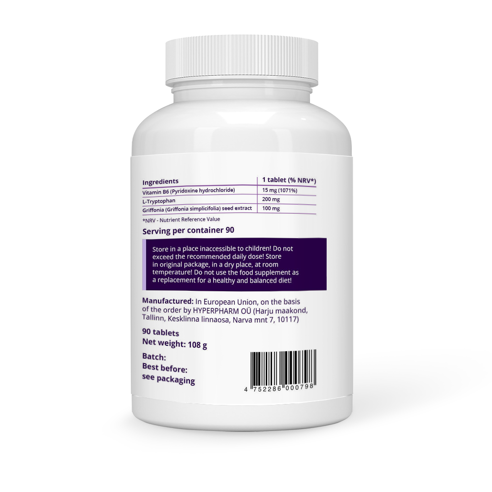 L-5-hydroxytryptophan (5-HTP) is the immediate precursor of serotonin. L-Tryptophan is an essential amino acid that is necessary for making proteins involved in the synthesis of melatonin and serotonin. Vitamin B6 contributes to normal energy-yielding metabolism, normal functioning of the nervous system, normal homocysteine metabolism, normal protein and glycogen metabolism. Vitamin B6 contributes to normal red blood cell formation and the normal function of the immune system.