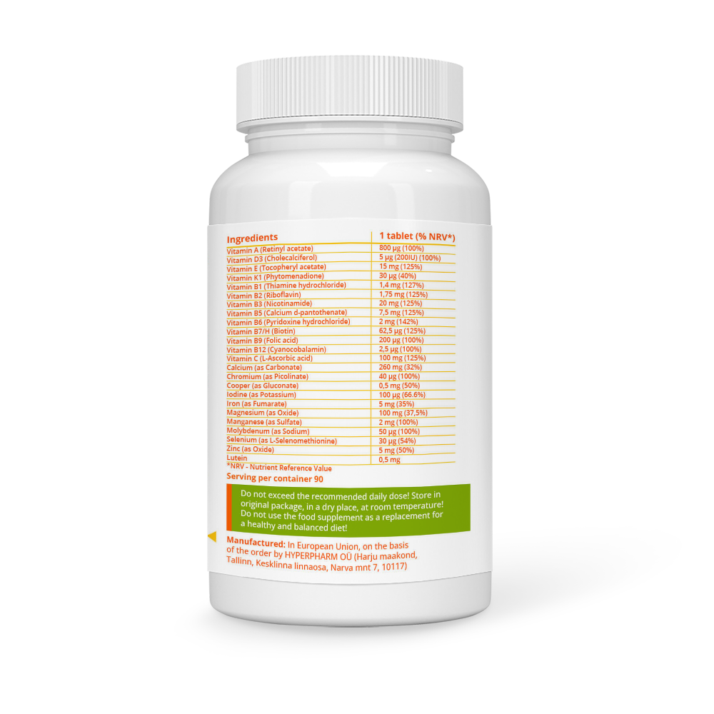 Ingredients: calcium carbonate; bulking agent: microcrystalline cellulose; magnesium oxide, L-Ascorbic acid, tocopheryl acetate, nicotinamide, iron (II) fumarate, marigold (Calendula officinalis) extract (lutein 5%); anti-caking agent: magnesium stearate, silicon dioxide; calcium d-pantothenate, zinc oxide, L-Selenomethionine; coating: hydroxypropylmethylcellulose; manganese (II) sulfate, retinyl acetate, cooper (II) gluconate, pyridoxine hydrochloride, riboflavin, thiamine hydrochloride, cholecalciferol, phytomenadione, chromium (III) picolinate, folic acid, potassium iodide, sodium molybdate, D-Biotin, cyanocobalamin.
