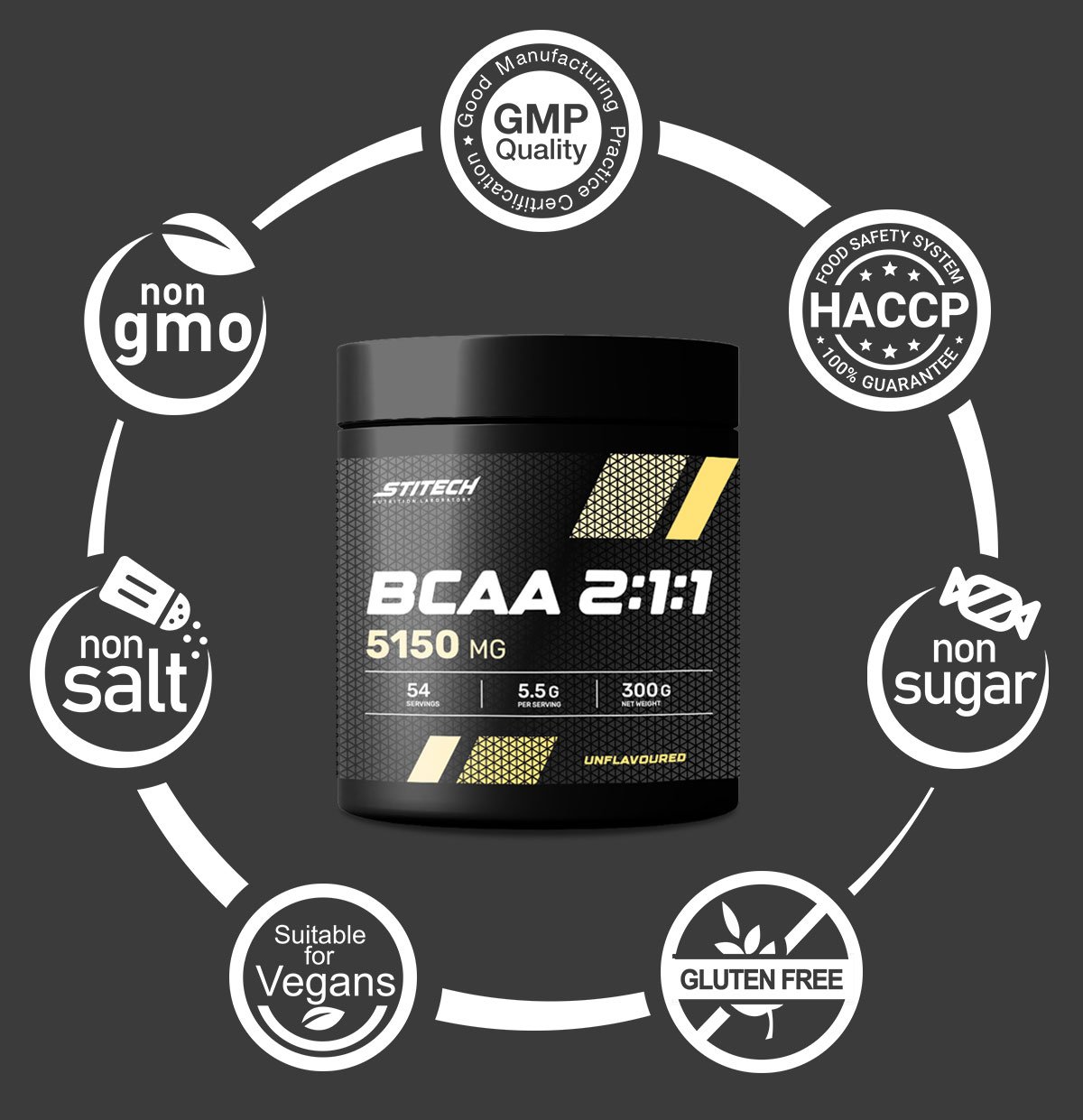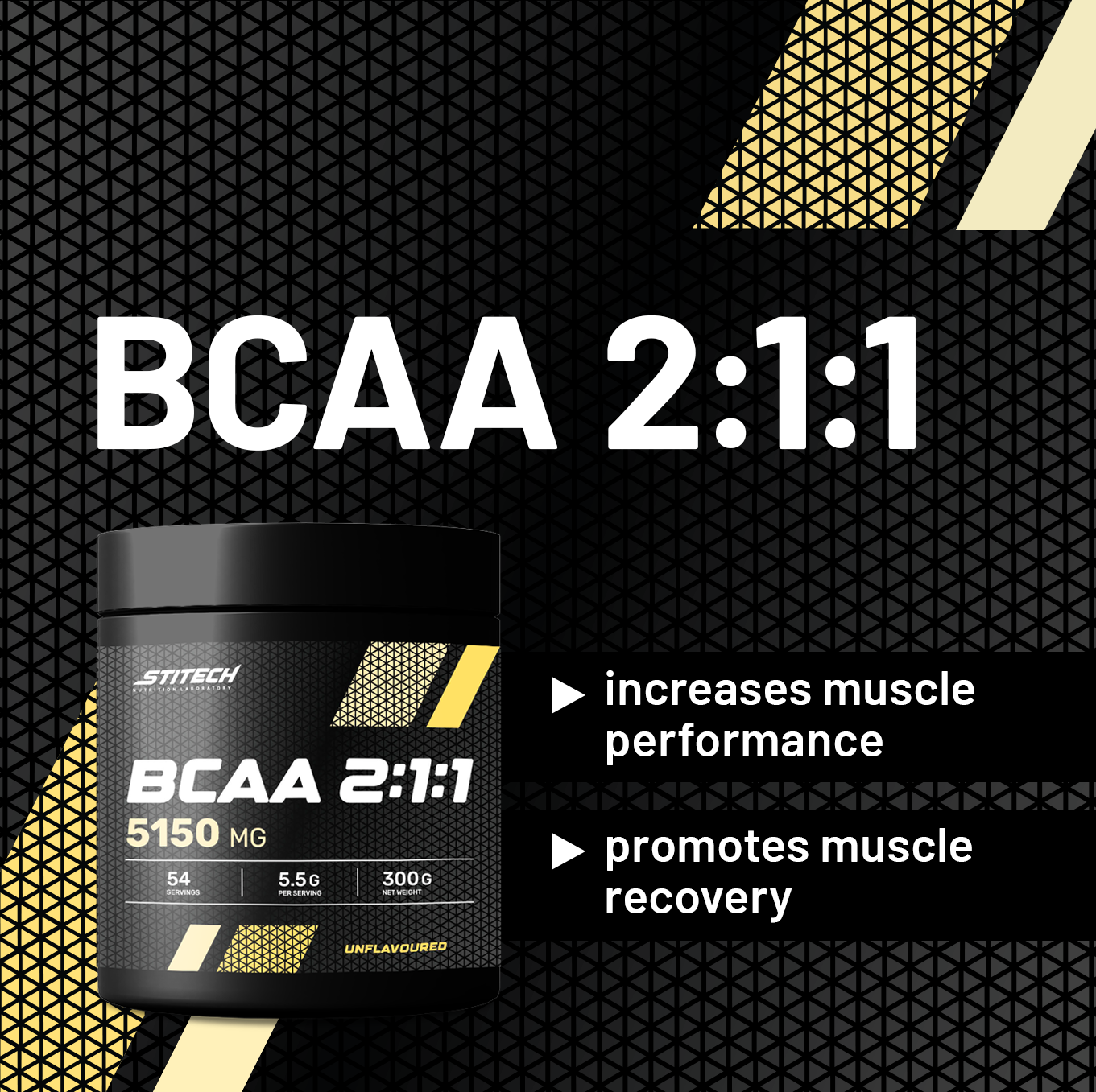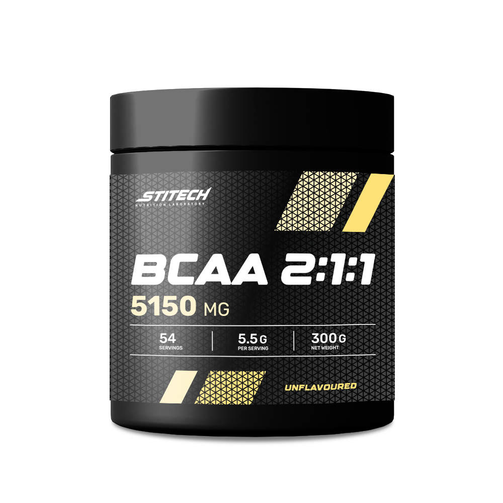 Stitech BCAA 2:1:1 5150mg provides essential branched-chain amino acids to support muscle recovery and growth, delivering effective boost to your workout routine.