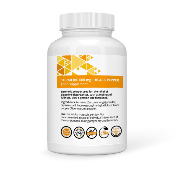 Original price was: €12.50.€9.30Current price is: €9.30.Turmeric 600 mg+Black Pepper Vegan Capsules