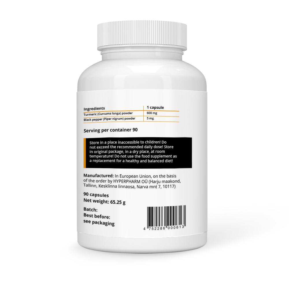Ingredients: turmeric (Curcuma longa) powder; capsule shell: hydroxypropylmethylcellulose; black pepper (Piper nigrum) powder.