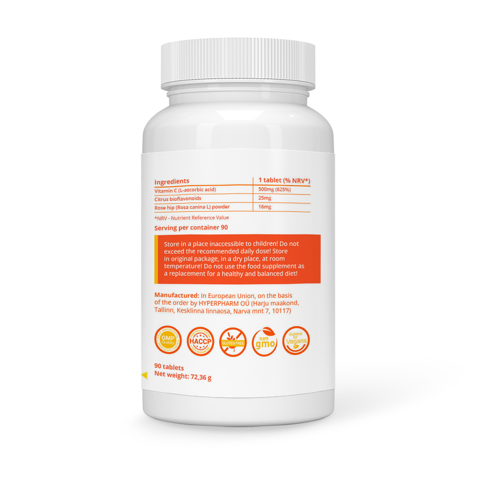 Vitamin C 500mg + Citrus bioflavonoids + Rose hips powder vegan tablets