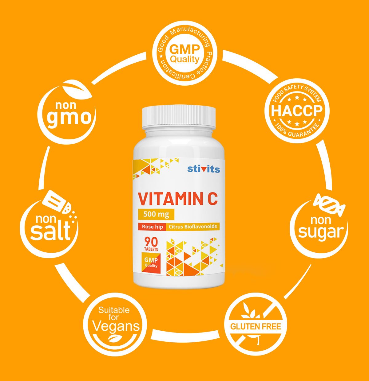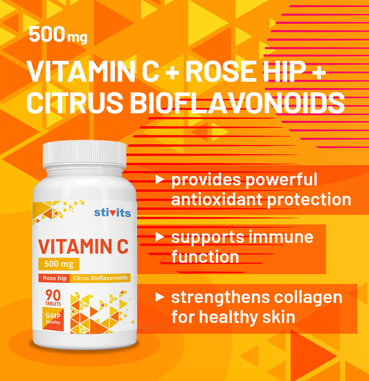 Vitamin C 500 mg + Citrus bioflavonoids + Rose hips powder include the following: